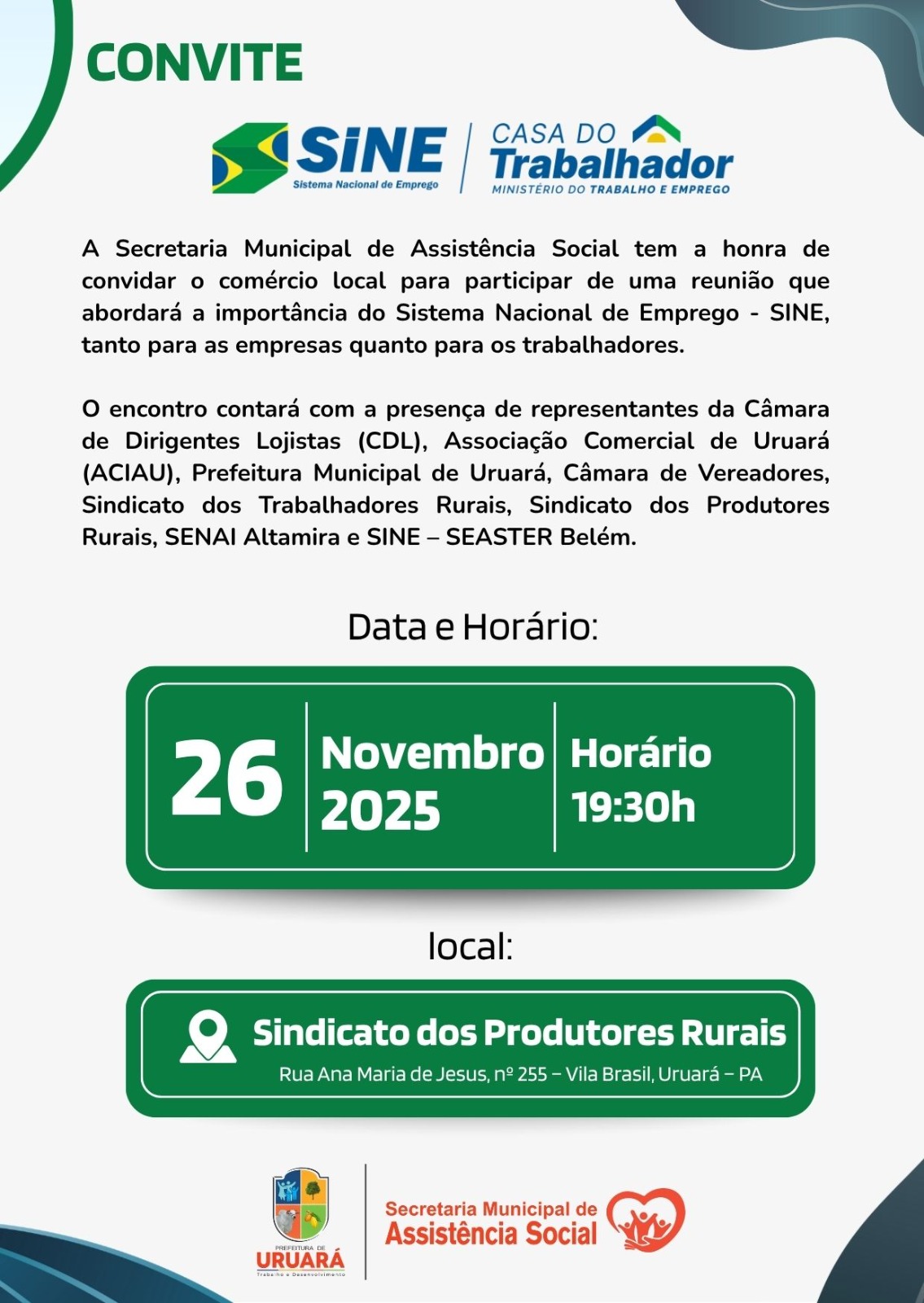 A Secretaria Municipal de Assistência Social convida o comércio local para uma reunião sobre a importância do SINE (Sistema Nacional de Emprego) para empresas e trabalhadores.